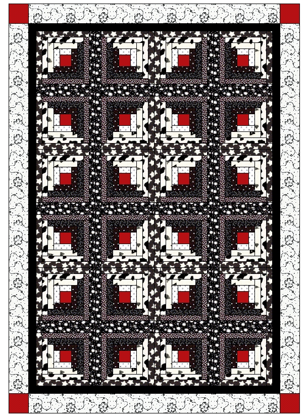 As mentioned in a previous post, I have been playing with Quilt Wizard and came up with a design for a black & white & red log cabin quilt top - the fabrics in QW are not quite the same as I have used, but it gives the general idea